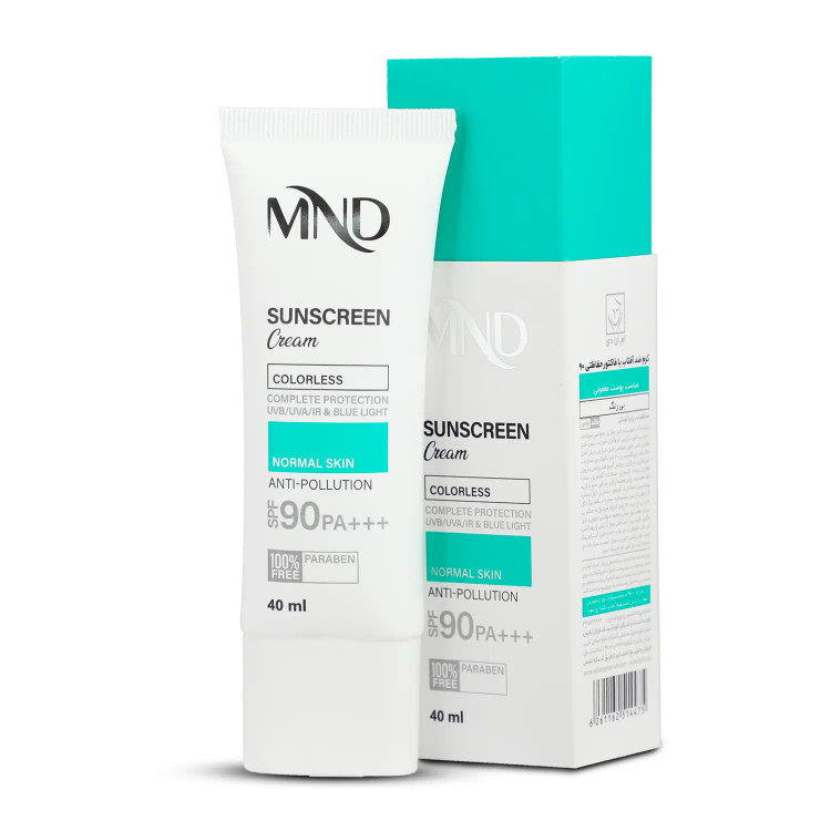 کرم ضدآفتاب بی رنگ با فاکتور حفاظتی 90 برند MND برای پوستهای معمولی تهیه شده است و فیلترهای استفاده شده در آن قابلیت جلوگیری از ورود اشعههای UVA و UVB خورشید به پوست را دارند. همچنین در این محصول، از عصاره علف هفتبند برای جلوگیری از اثر تخریبی اشعه مادون قرمز بر روی فیبرهای پروتئینی پوست و عصاره ساقه/برگ/گل لادن برای ممانعت از اثرگذاری سوء نور آبی ساطع شده از وسایل الکترونیکی پیرامون انسان بر پوست کمک گرفته شده است تا محافظت کاملی از پوست در برابر طیف وسیعی از اشعهها، حاصل شود. علاوه بر اینها از منگنز پیسیای، نیاسینامید (ویتامین ب 3) و مشتقات پایدار ویتامین سی برای تقویت و ارتقا سلامت پوست کمک گرفته شده که به همراه عصاره آلوئهورا موجب حفظ جوانی و شادابی پوست میشوند. روغن مورد استفاده در این کرم ضدآفتاب، روغن هسته آرگان میباشد که ترکیب متعادلی از انواع اسیدهای چرب را در خود داشته و به خوبی نیازهای پوست نسبت به اسیدهای چرب را تامین میکند. با توجه به اینکه محصولات ضدآفتاب اکثرا در محیط بیرون منزل مورد استفاده قرار میگیرند، از عصاره گل کاملیا ژاپنی نیز در این کرم استفاده شده تا ذرات معلق و فلزات سنگین موجود در محیط پیرامون افراد نتوانند با تولید ترکیبات آسیبزا و التهابی به پوست آنها آسیب برسانند.
